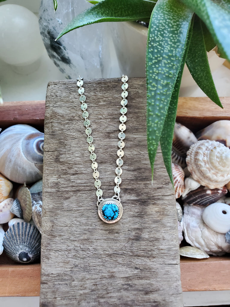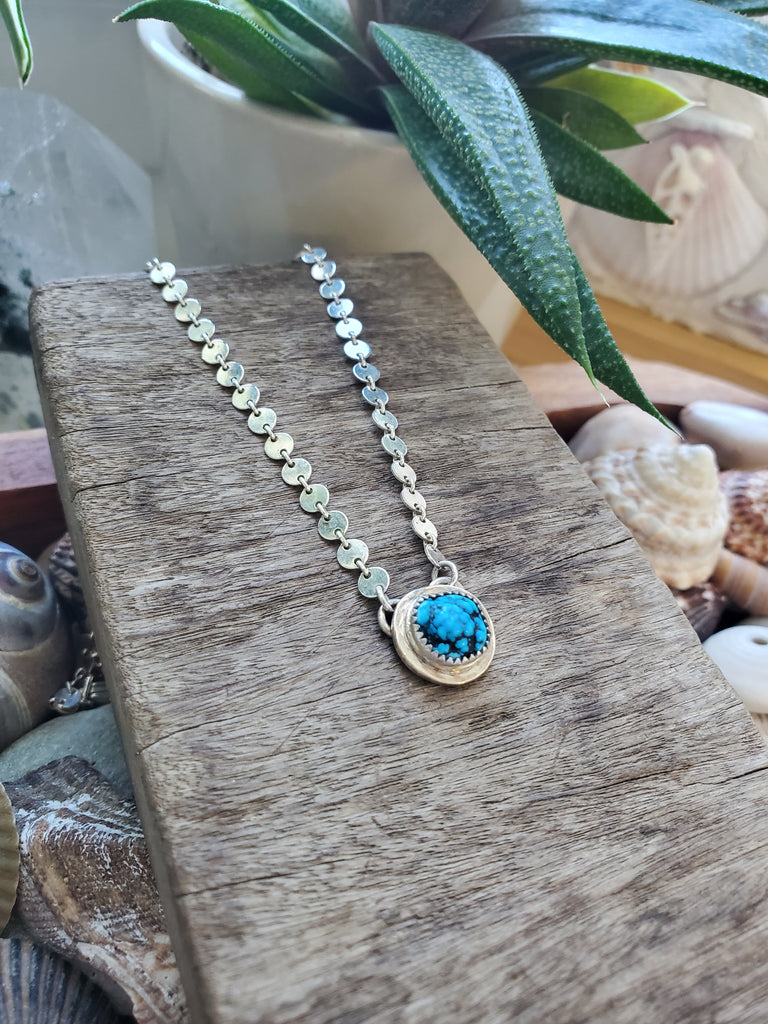 Handmade using recycled sterling silver, this ethically sourced chunky Kingman turquoise nugget sits around the collar bone area and will fit most as a choker style necklace. The chain is approximately 14" in length. Turquoise is considered to be the stone of life, beauty, and good fortune.