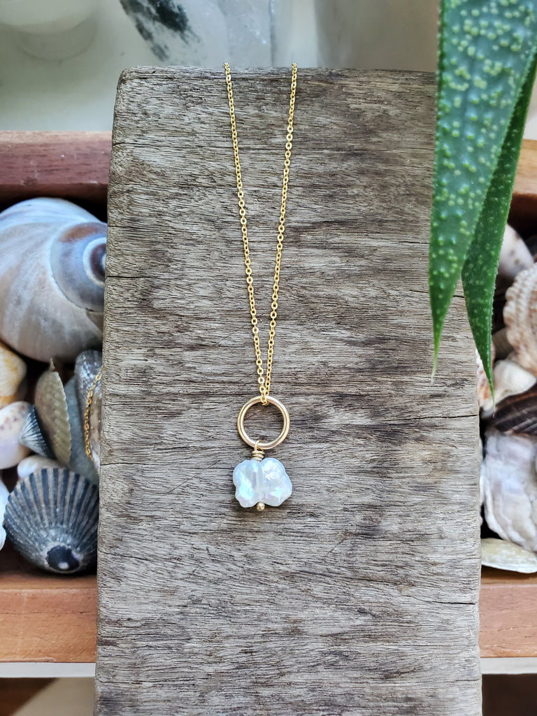 A unique version of our classic golden pearl drop, this handmade necklace features a one of a kind natural freeform shaped pearl and 14k gold-filled metal strung onto a 16" chain.